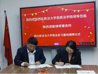 程淑娟与蒋虎军代表双方签署就业实习基地合作协议,朱茂向陕西君勤律师事务所授牌。